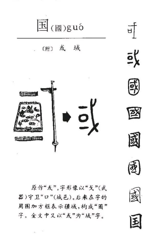 其实“国”的初文是“或”,也是“域”的古字。字的构形,有土地——“一”,有保卫城池土地的武力——“戈”,字形像以“戈”(武器)守卫“口”(城邑)。后来在字的周围加方框表示疆域,构成“國”字,也就是今天的“国”字。